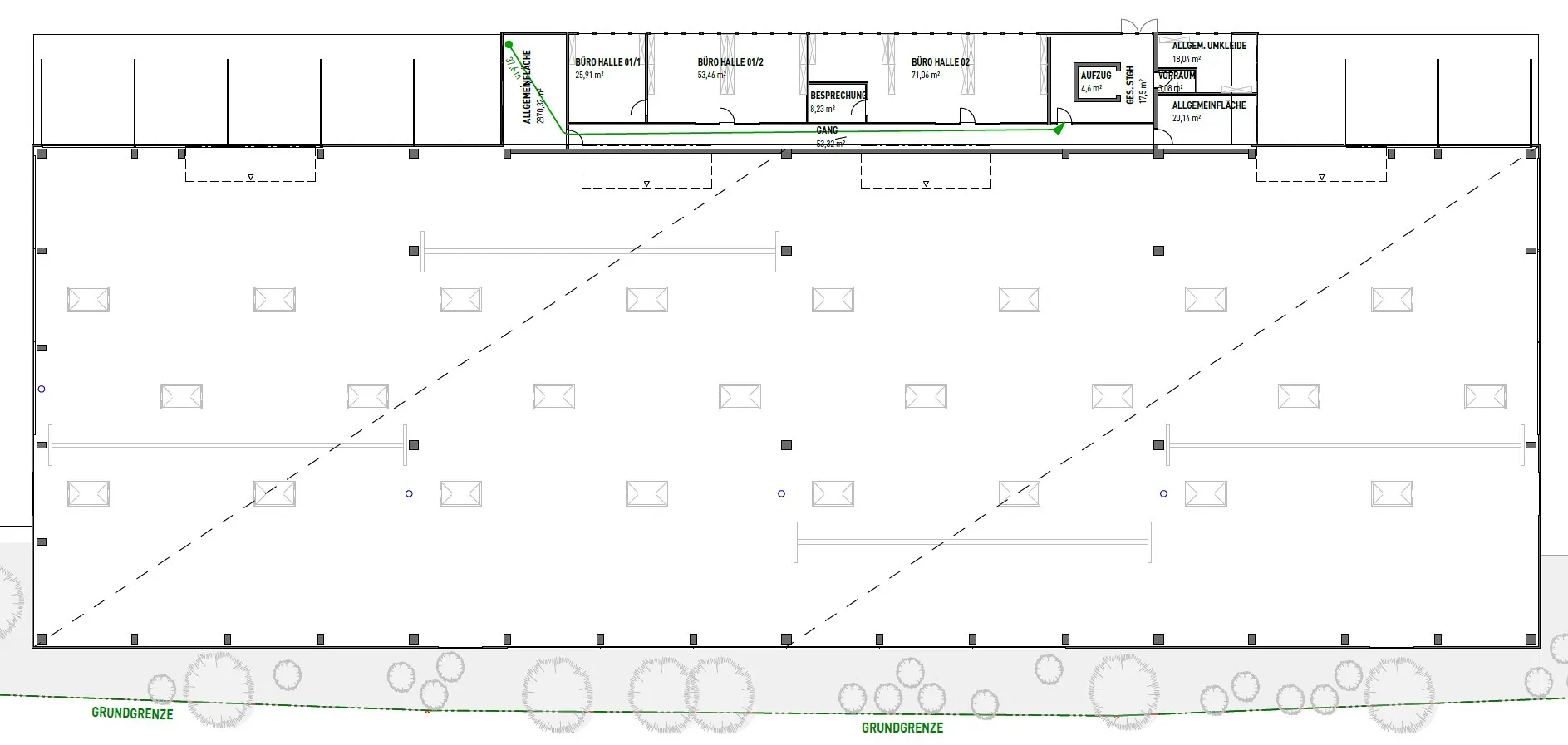 Die 2026 erstmals zu nutzende Industriehalle ist heiz- und kühlbar, mit Klimaanlage und Luftheizung ausgestattet. Die Halle verfügt über 4 Rolltore und eine Vorrichtung für einen Hallenkran. Das Büro befindet sich im Obergeschoss vor der Halle und ist sowohl über einen Lift als auch über ein Stiegenhaus erreichbar. Besonders flexibel ist die Nutzungsmöglichkeit: Sowohl die Halle als auch die Büroflächen können in bis zu 4 Einheiten geteilt werden, wodurch verschiedene Mietvarianten möglich sind.